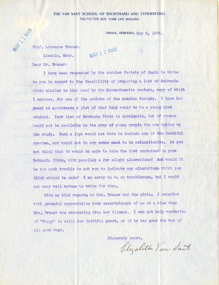 THE VAN SANT SCHOOL OF SHORTHAND AND TYPEWRITING 716-717-718 New York Life Building Omaha, Nebreaska, May 9, 1903. May 11 Rec'd May 12 Ans'd Prof. Lawrence Bruner. Lincoln, Nebr. Dear Mr. Bruner: I have been requested by the Audubon Society of Omaha to write to you in regard to the feasibility of preparing a list of Nebraska birds similar to that used by the Massachusetts society, copy of which I enclose, for use of the members of the Audubon Society. I know how great an assistance a list of that kind would be to a young bird student. Your list of Nebraska Birds is invaluable, but of course would not be available to the army of young people who are taking up the study. Such a list would not have to include any of the doubtful species, and would not in any sense need to be authoritative. Do you not think that it would be safe to take the list contained in your Nebraska Birds, with possibly a few slight alterations? And would it be too much trouble to ask you to indicate any alterations which you think should be made? I am sorry to be so troublesome, but I could not very well refuse to write for them. Give my kind regards to Mrs. Bruner and the girls. I remember with grateful appreciation your entertainment of me at a time when Mrs. Bruner was recovering from her illness. I can not help wondering if "Puggy" ois still her faithful guard, or if he has gone the way of all good dogs. Sincerely yours. Elizabeth Van Sant
