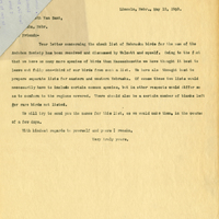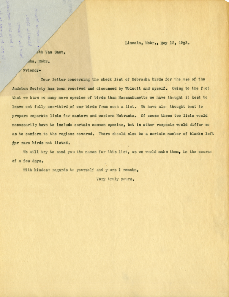 Lincoln, Nebr., May 12, 1903. th Van Sant, ha, Nebr. Friend:- Your letter concerning the check list of Nebraska birds for the use of the Audubon Society has been received and discussed by Wolcott and myself. Owing to the fact that we have so many more species of birds than Massachusetts we have thought it best to prepare separate lists for eastern and western Nebraska. Of course these two lists would necessarily have to include certain common species, but in other respects would differ so as to conform to the regions covered. There should also be a certain number of blanks left for rare birds not listed. We will try to send you the names for this list, as we would make them, in the course of a few days. With kindest regards to yourself and yours I remain, Very truly yours,