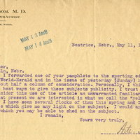 Arte. Folsom, M. D. Oculist and Aurist. Beatrice, Nebr. May 13 Ans'd May 14 Ans'd Beatrice, Nebr., May 11, 1903. Prof. Bruner, Lincoln, Nebr. Dear Sir:-I forwarded one of your pamphlets to the sporting editor of The Omaha World-Herald and in the issue of yesterday (Sunday) he gave the subject about half a column of consideration. Personally, I think this one of the best ways to give these subjects publicity. I trust that you do not consider this use of the article an unwarranted familiarity. Just at present we are interested in what we call the "yellow-headed blackbird." I have seen several flocks of them this spring and I have no authorities which give me any light on the subject. I would appreciate any light which you may be able to shed on the subject. I remain, Yours very truly, Arte. Folsom