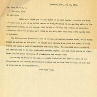 Typewritten letter, 1 page, attached to May 11, 1902, from Lawrence Bruner to Arte Folsom, "Allow me to thank you for your favor…"