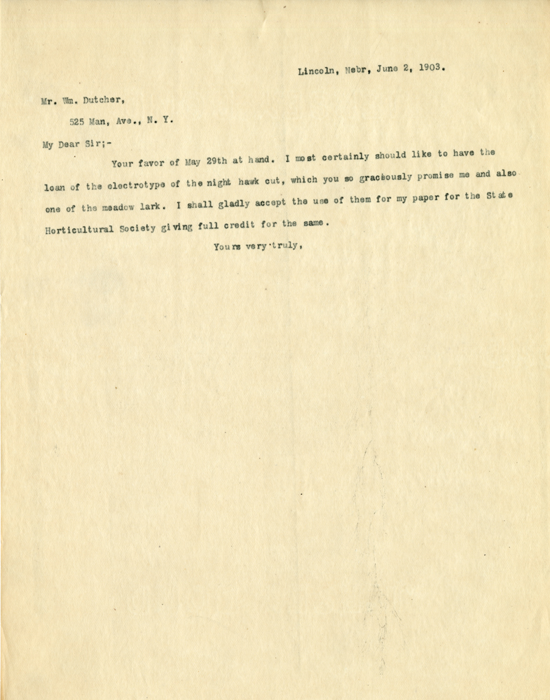 Lincoln, Nebr., June 2, 1903. Mr. Wm. Dutcher, 525 Man. Ave., N. Y. My Dear Sir:- Your favor of May 29th at hand. I most certainly should like to have the loan of the electrotype of the night hawk cut, which you so graciously promise me and also one of the meadow lark. I shall gladly accept the use of them for my paper for the State Horticultural Society giving full credit for the same. Yours very truly
