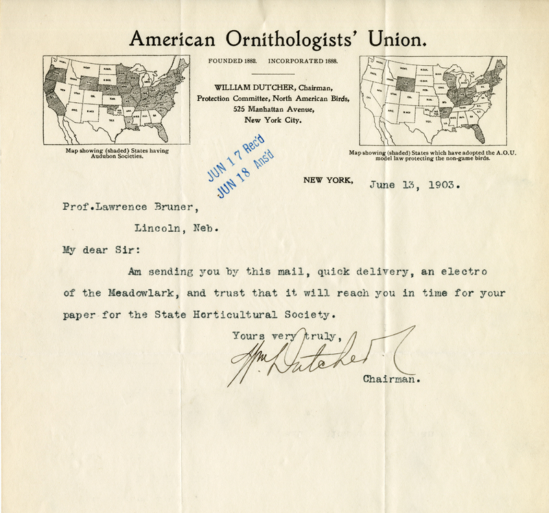 American Ornithologists' Union. Founded 1883. Incorporated 1888. William Dutcher, Chairman, Protection Committee, North American Birds, 525 Manhattan Avenue, New York City. Map showing (shaded) states having Audubon Societies. Map showing (shaded) States which have adopted the A.O.U. model law protecting the non-game birds. Jun 17 Rec'd Jun 18 Ans'd New York, June 13, 1903. Prof. Lawrence Bruner, Lincoln, Neb. My dear Sir: Am sending you by this mail, quick delivery, an electro of the Meadowlark, and trust that it will reach you in time for your paper for the State Horticultural Society. Yours very truly, Wm Dutcher Chairman.