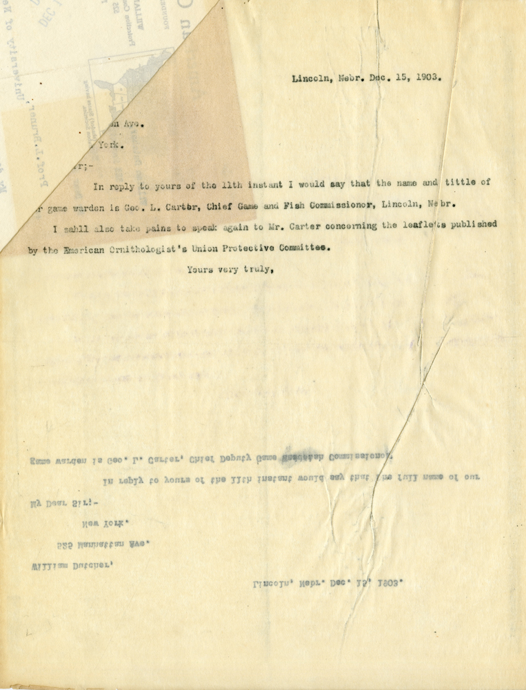 Lincoln, Nebr. Dec. 15, 1903. Ave. York. Sir:- In reply to yours of the 11th instant I would say that the name and tittle of our game warden is Geo. L. Carter, Chief Game and Fish Commissioner, Lincoln, Nebr. I shall also take pains to speak again to Mr. Carter concerning the leaflets published by the American Ornithologist's Union Protective Committee. Yours very truly,