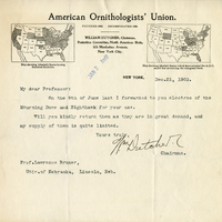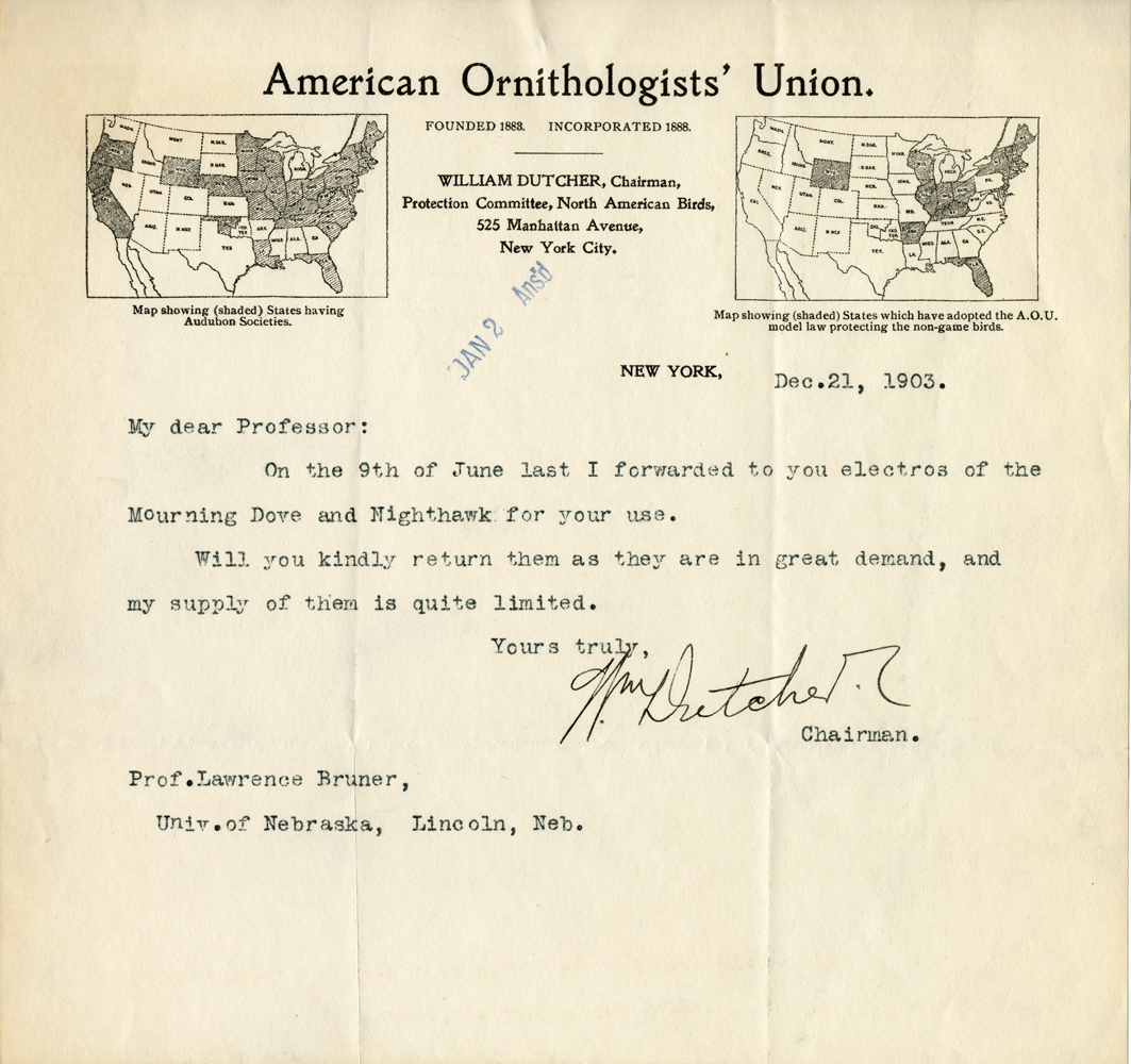 American Ornithologists' Union. Founded 1883. Incorporated 1888. William Dutcher, Chairman, Protection Committee, North American Birds, 525 Manhattan Avenue, New York City. Map showing (shaded) States having Audubon Societies. Map showing (shaded) States which have adopted the A.O.U. model law protecting the non-game birds. Jan 2 Ans'd New York, Dec.21, 1903. My dear Professor: On the 9th of June last I forwarded to you electros of the Mourning Dove and Nighthawk for your use. Will you kindly return them as they are in great demand, and my supply of them is quite limited. Yours truly, Wm. Dutcher Chairman. Prof. Lawrence Bruner, Univ. of Neraska, Lincoln, Neb.