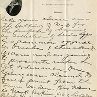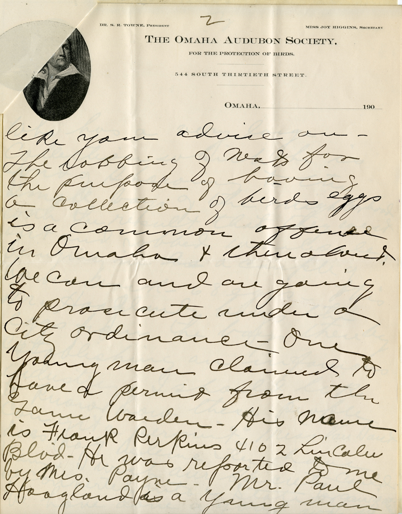 2 Dr. S. R. Towne, President Miss Joy Higgins, Secretary The Omaha Audubon Society. For the Protection of Birds. 544 South Thirtieth Street Omaha, 190 like your advice on- The robbing of nests for the purpose of having a collection of birds eggs is a common offense in Omaha & thereabout. We can and are going to prosecute under a city ordinance. One young main claimed to have permit from the Game Warden. His name is Frank Perkins 4102 Lincoln Blvd. He was reported to me by Mrs. Payne, Mr. Paul Hoagland is a young man