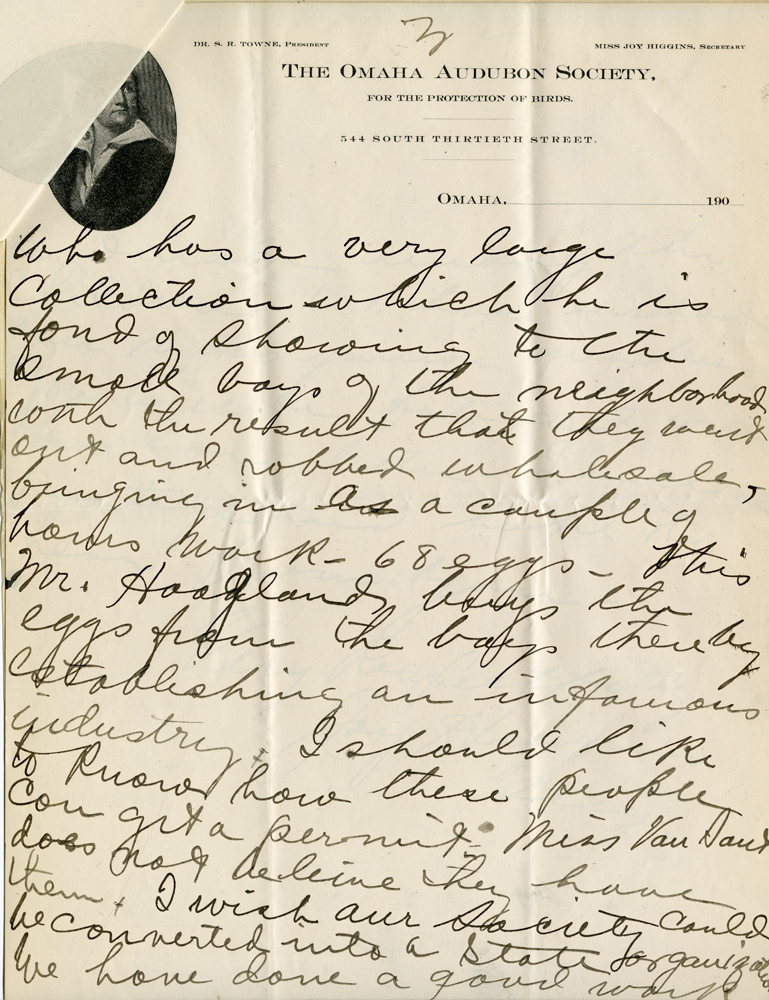 3 Dr. S. R. Towne, President Miss Joy Higgins, Secretary The Omaha Audubon Society. For the Protection of Birds. 544 South Thirtieth Street Omaha 190 who has a very large collection which he is fond of showing to the small boys of the neighborhood with the result that they went out and robbed wholesale, bringing in as a couple of hours work - 68 eggs - This Mr. Hoagland buys the eggs from the boys thereby establishing an infamous industry. I should like to know how these people can get a permit. Miss Van Sant does not believe they have them. I wish our Society could be converted into a State organization. We have done a good work