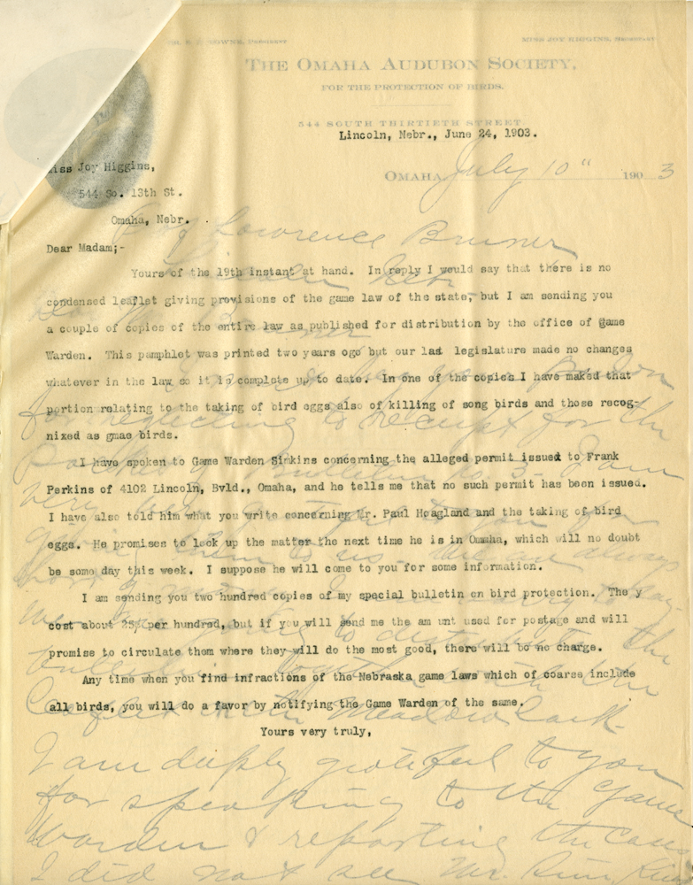 Lincoln, Nebr., June 24, 1903. Miss Joy Higgins, 544 S. 13th St. Omaha, Nebr. Dear Madam;- Yours of the 19th instant at hand. In reply I would say that there is no condensed leaflet giving provisions of the game law of the state, but I am sending you a couple of copies of the entire law as published for distribution by the office of game Warden. This pamphlet was printed two years ago but our last legislature made no changes whatever in the law so it is complete up to date. In one of the copies I have maked that portion relating to the taking of bird eggs also of killing of song birds and those recognized as gmae birds. I have spoken to Game Warden Simkins concerning the alleged permit issued to Frank Perkins of 4102 Lincoln, Blvd., Omaha, and he tells me that no such permit has been issued. I have also told him what you write concerning Mr. Paul Hoagland and the taking of bird eggs. He promises to lock up the matter the next time he is in Omaha, which will no doubt be some day this week. I suppose he will come to you for some information. I am sending you two hundred copies of my special bulletin on bird protection. They cost about 25 cents per hundred, but if you will send me the amount used for postage and will promise to circulate them where they will do the most good, there will be no charge. Any time when you find infractions of the Nebraska game laws which of course include all birds, you will do a favor by notifying the Game Warden of the same. Yours very truly,