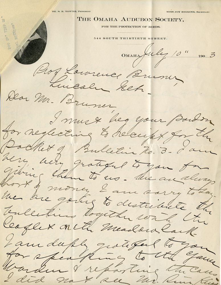 Dr. S. R. Towne, President MIss Joy Higgins, Secretary The Omaha Audubon Society. For the Protection of Birds. 544 South Thirtieth Street Omaha, July 10" 1903 Prof. Lawrence Bruner Lincoln Nebr. Dear Mr. Bruner, I must beg your pardon for neglecting to receipt for the packet of Bulletin No 3. I am very very grateful to you for giving them to us. We are always short of money I am sorry to say. We are going to distribute the bulletins together with the leaflet on the Meadowlark. I am deeply grateful to you for speaking to the Game Warden & reporting the cases. I did not see Mr. Simkins