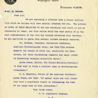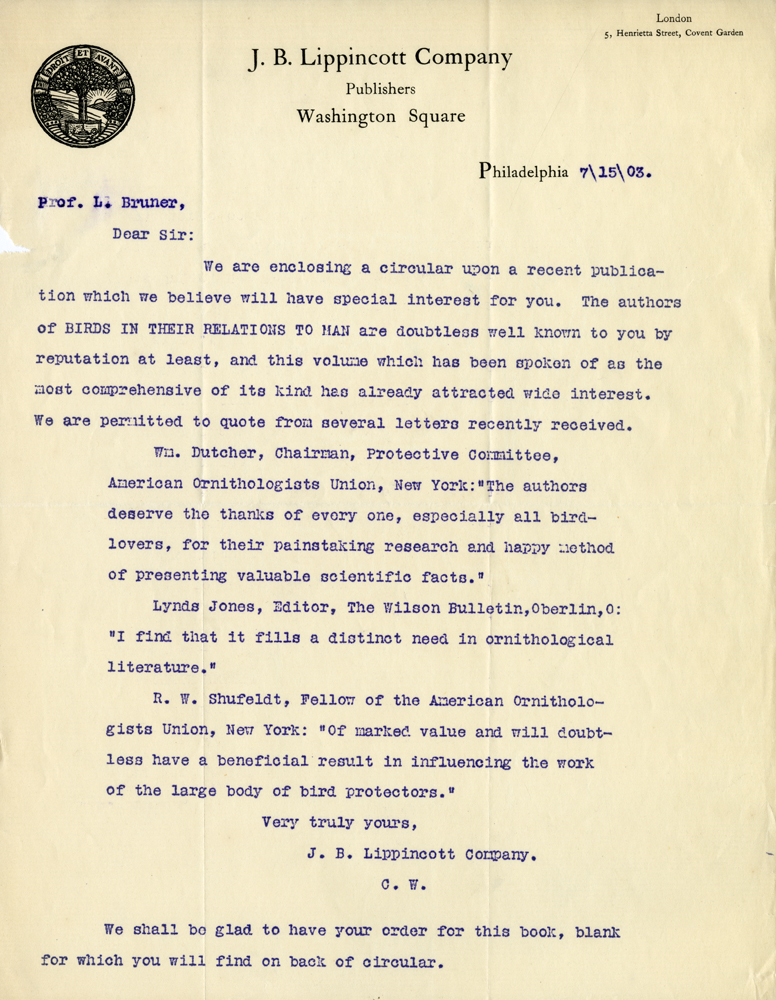 London 5, Henrietta Street, Covent Garden J. B. Lippincott Company Publishers Washington Square Philadelphia 7/15/01 Prof. L. Bruner, Dear Sir: We are enclosing a circular upon a recent publication which we believe will have special interest for you. The authors of BIRDS IN THEIR RELATION TO MAN are doubtless well known to you by reputation at least, and this volume which has been spoken of as the most comprehensive of its kind has already attracted wide interest. We are permitted to quote from several letters recently received. Wm. Dutcher, Chairman, Protective Committee, American Ornithologists Union, New York: "The authors deserve the thanks of every one, especially all bird-lovers, for their painstaking research and happy method of presenting valuable scientific facts." Lynda Jones, Editor, The Wilson Bulletin, Oberlin, O: "I find that it fills a distinct need in ornithological literature." R. W. Shufeldt, Fellow of the American Ornithologists Union, New York: "Of marked value and will doubtless have a beneficial result in influencing the work of the large body of bird protectors." Very truly yours, J. B. Lippincott Company. C. W. We shall be glad to have your order for his book, blank for which you will find on back of circular.