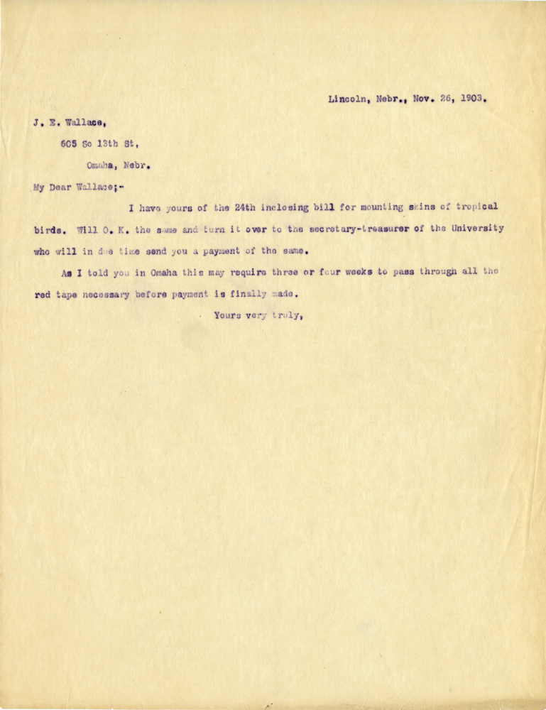 Lincoln, Nebr., Nov. 26, 1903. J. E. Wallace 515 So 13th St. Omaha, Nebr. My Dear Wallace:- I have yours of the 24th inclosing bill for mounting skins of tropical birds. Will O.K. the same and turn it over to the secretary-treasurer of the University who will in due time send you a payment of the same. As I told you in Omaha this may require three or four weeks to pass through all the red tape necessary before payment is finally made. Yours very truly,