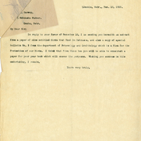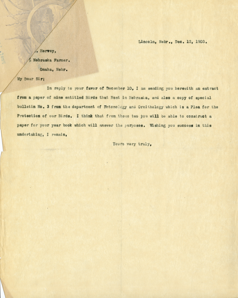 Lincoln, Nebr., Dec. 12, 1903. Harvey, Nebraska Farmer. Omaha, Nebr. My Dear Sir; In reply to your favor of December 10, I am sending you herewith an extract from a paper of mine entitled Birds that Nest in Nebraska, and also a copy of special bulletn No. 3 from the department of Entomology and Ornithology which is a Plea for the Protection of our Birds. I think that from these two you will be able to construct a paper for your year book which will answer the purposes. Wishing you success in this undertaking, I remain, Yours very truly,
