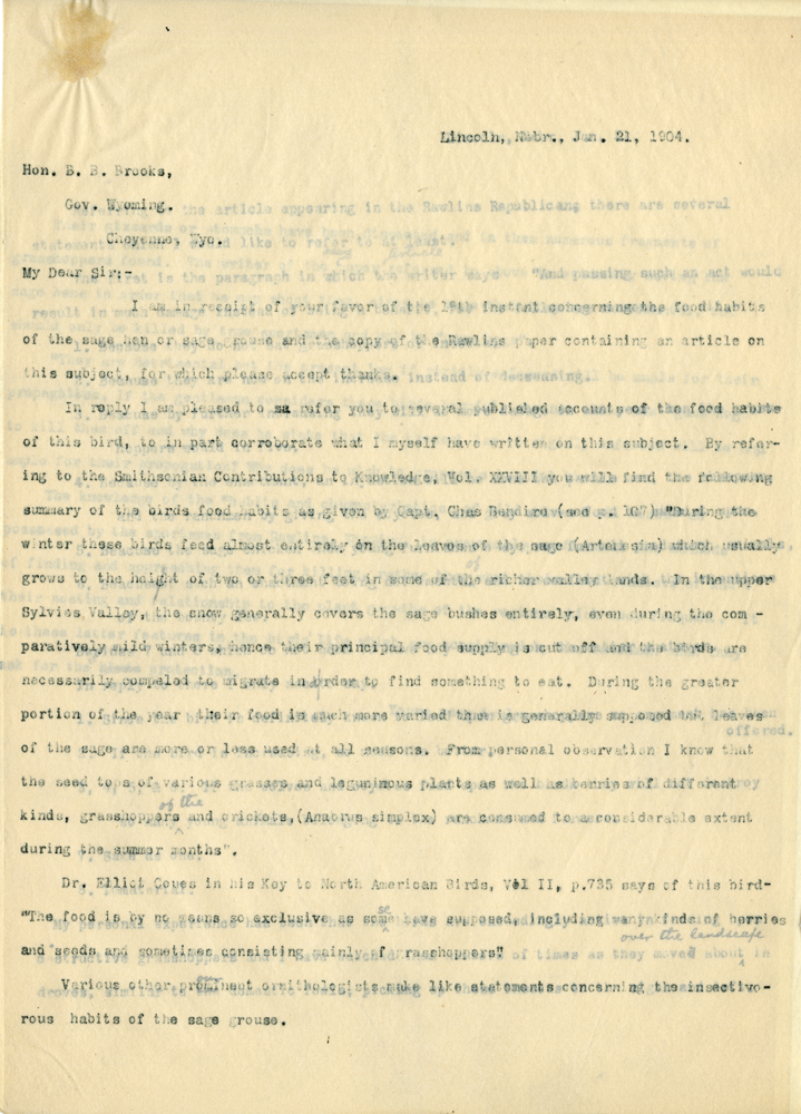 Lincoln, Nebr., Jan. 21, 1904. Hon. B. B. Brooks, Gov. Wyoming. Cheyenne, Wyo. My Dear Sir:- I am in receipt of your favor of the 19th instant concerning the food habits of the sage hen or sage grouse and the copy of the Rawlins paper containing an article on this subject, for which please accept thanks. In reply I am pleased to refer you to several published accounts of the food habits of this bird, to in part corroborate what I myself have written on this subject. By refering to the Smithsonian Contributions to Knowledge, Vol. XXVIII you will find the following summary of the birds food habits as given by Capt. Chas Bandiro (see p. 107) "During the winter these birds feed almost entirely on the leaves of the sage (Arte[illegible]) which usually grows to the height of two or three feet in some of the richer valley lands. In the upper Sylvies Valley, the snow generally covers the sage bushes entirely, even during the comparatively mild winters, hence their principal food supply is cut off and the birds are necessarily compeled to migrate in order to find something to eat. During the greater portion of the year their food is much more varied than is generally supposed but leaves of the sage are more or less used at all seasons. From personal observation I know that the seed tops of various grasses and leguminous plants as well as berries of different kinds, grasshoppers and crickets, (Amorun simplex) are consumed to a considerable extent during the summer months". Dr. Elliot Copes in his Key to North American Birds, Vol II, p.755 says of this bird- "The food is by no means so exclusive as some have supposed, including many kinds of berries and seeds and sometimes consisting mainly of grasshoppers." Various other prominent ornithologists make like statements concerning the insectivorous habits of the sage grouse.