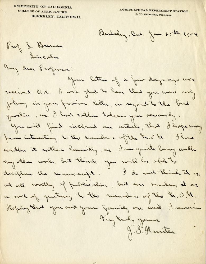 University of California College of Agriculture Berkeley, California Agricultural Experiment Station E. W. Hilgard, Director Berkeley, Cal Jan 25th 1904 Prof L. Bruner Lincoln My dear Professor:- Your letter of a few days ago was received O.K. I was glad to hear that you were only joking in your furious letter in regard to the bird question, as I had rather taken you seriously. You will find inclosed an article, that I hope may prove interesting to the members of the N.O.U. I have written it rather hurriedly, as I am quite busy with my other work, but think you will be able to decipher the manuscript. I do not think it is at all worthy of publication, but am sending it as a sort of greeting to the members of the N.O.U. Hoping that you and your family are well I remain Very truly yours J. S. Hunter