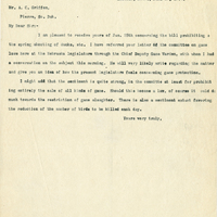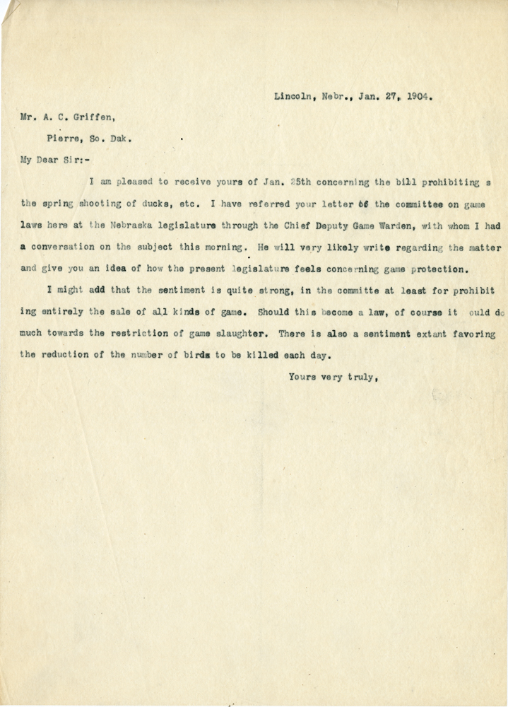 Lincoln, Nebr., Jan. 27, 1904. Mr. A. C. Griffen, Pierre, So Dak. My Dear Sir:- I am pleased to receive yours of Jan. 25th concerning the bill prohibiting the spring shooting of ducks, etc. I have referred your letter to the committee on game laws here at the Nebraska legislature through the Chief Deputy Game Warden, with whom I had a conversation on the subject this morning. He will very likely write regarding the matter and give you an idea of how the present legisltaure feels concerning game protection. I might add that the sentiment is quite strong, in the committee at least for prohibiting entirely the sale of all kinds of game. Should this become a law, of course it ould do much towards the restriction of game slaughter. There is also a sentiment extant favoring the reduction of the number of birds to be killed each day. Yours very truly,