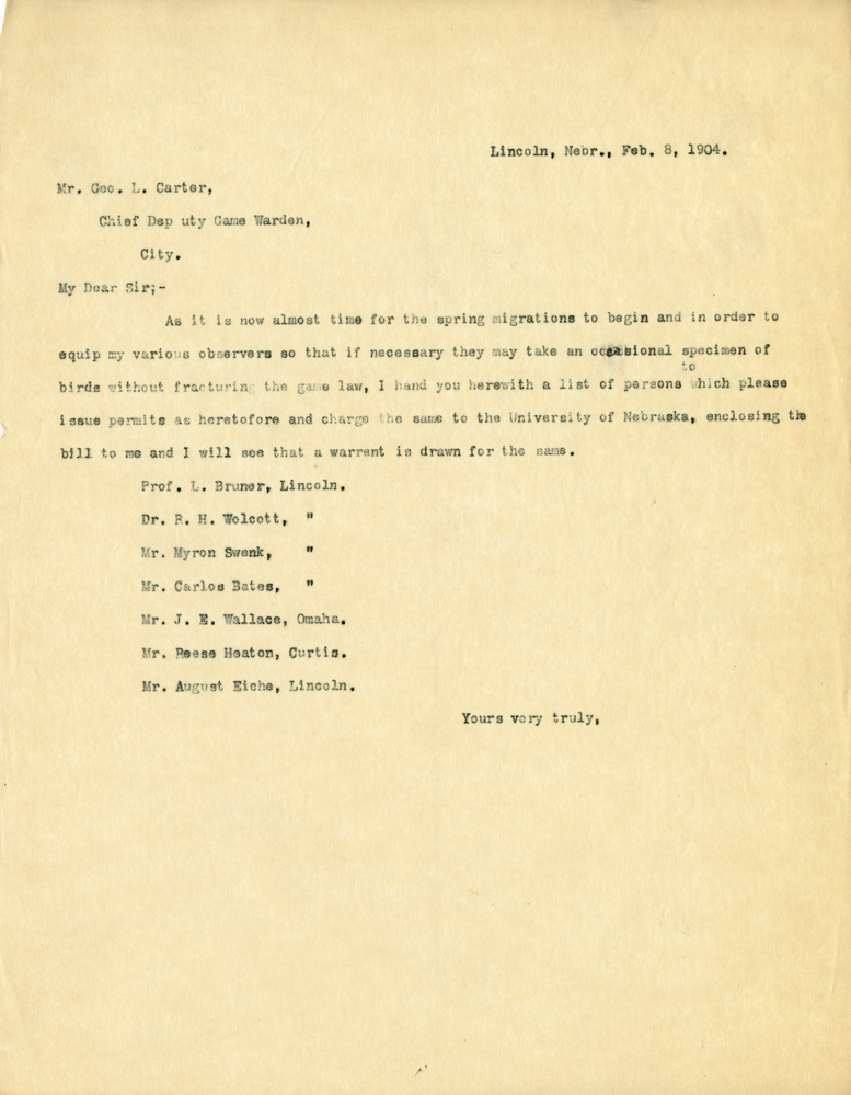 Lincoln, Nebr., Feb. 8, 1904. Mr. Geo L. Carter, Chief Dep uty Game Warden City. My Dear Sir;- As it is now almost time for the spring migrations to begin and in order to equip my various observers so that if necessary they may take an occasional specimen of birds without fracturing the game law, I hand you herewith a list of persons to which please issue permits as heretofore and charge the same to the University of Nebraska, enclosing the bill to me and I will see that a warrant is drawn for the same. Prof. L. Bruner, Lincoln. Dr. R. H. Wolcott, " Mr. Myron Swenk, " Mr. Carlos Bates, " Mr. J. E. Wallace, Omaha. Mr. Reese heaton, Curtis Mr. August Eiche, Lincoln. Yours very truly,