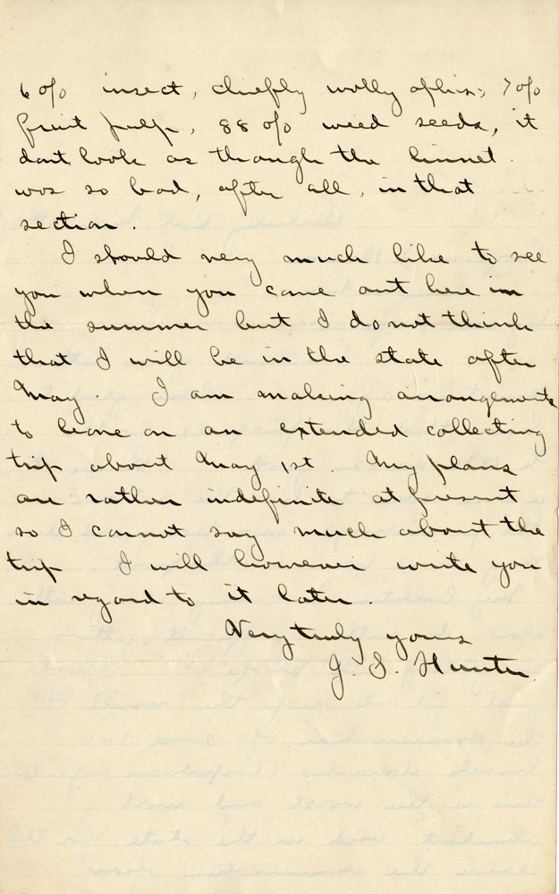 6% insect, chiefly wolly aphids; 7% fruit pulp, 88% weed seeds, it don't look as though the linnet was so bad, after all, in that section. I should very much like to see you when you come out here in the summer but I do not think that I will be in the state after May. I am making arrangements to leave on an extended collecting trip about May 1st. My plans are rather indefinite at present so I cannot say much about the trip I will however write you in regard to it later. Very truly yours J. S. Hunter