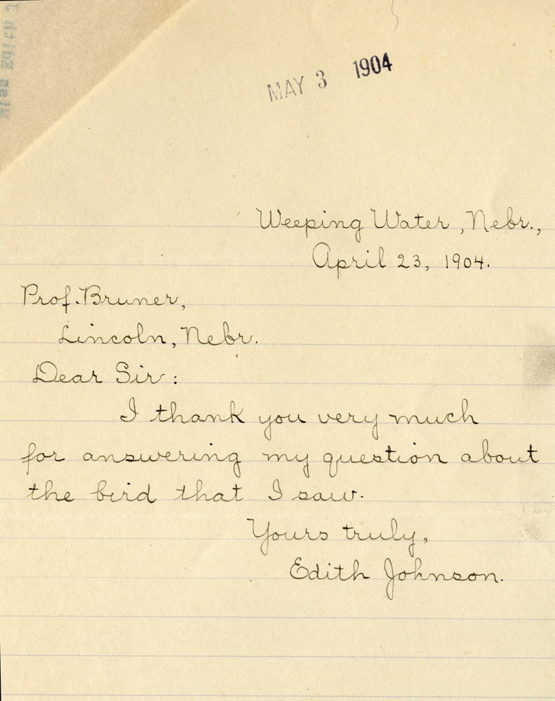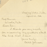 MAY 3 1904 Weeping Water, nebr., April 23, 1904. Prof. Bruner. Lincoln, Nebr. Dear Sir: I thank you very much for answering my question about the bird that I saw. Yours truly, Edith Johnson