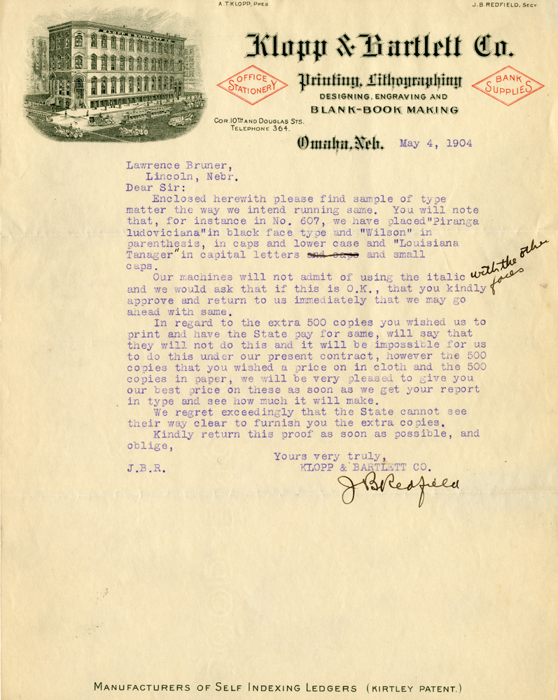 A. T. Klopp, Pres. J. B. Redfield, Secy Klopp & Bartlett Co. Printing, Lithographing Designing, Engraving and Blank-Book Making Office Stationery Bank Supplies Cor. 10th and Douglas Sts. Telephone 364. Omaha, Neb. May 4, 1904 Lawrence Bruner, Lincoln, Nebr. Dear Sir: Enclosed herewith please find sample of type matter the way we intend running same. You will note that, for instance in No. 607, we have placed "Piranga ludoviciana" in black face type and "Wilson" in parenthesis, in caps and lower case and "Louisiana Tanager" in capital letters and small caps. Our machines will not admit of using the italic with other faces and we would ask that if this is O.K., that you kindly approve and return to us immediately that we may go ahead with same. In regard to the extra 500 copies you wished us to print and have the State pay for same, will say tht they will not do this and it will be impossible to do this under our present contract, however the 500 copies that you wished a price on in cloth and the 500 copies in paper, we will be very pleased to give you our best price on these as soon as we get your report in type and see how much it will make. We regret exceedingly that the State cannot see their way clear to furnish you the extra copies. Kindly return this proof as soon as possible, and oblige, Yours very truly, Klopp & Bartlett Co. J. B. Redfield J. B. R.