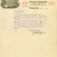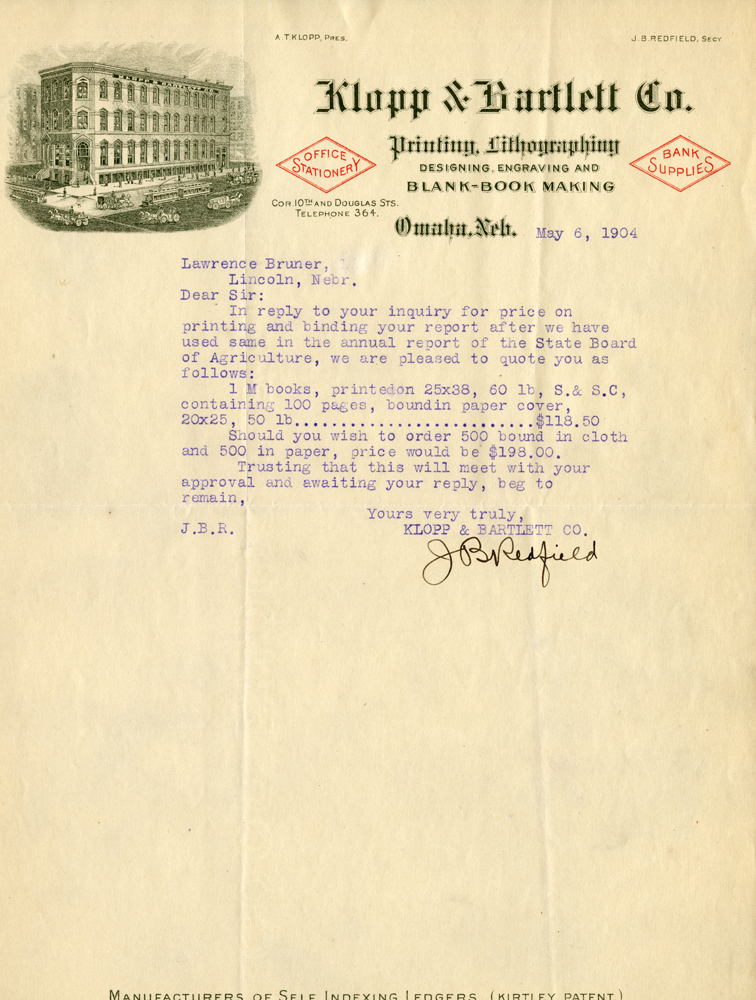 A. T. Klopp, Pres. J. B. Redfield, Secy Klopp & Bartlett Co. Printing, Lithographing Designing, Engraving and Blank-Book Making Office Stationery Bank Supplies Cor. 10th and Douglas Sts. Telephone 364. Omaha, Neb. May 6, 1904 Lawrence Bruner, Lincoln, Nebr. Dear Sir: In reply to your inquiry for price on printing and binding your report after we have used same in the annual report of the State Board of Agriculture, we are pleased to quote you as follows: 1M books, printed on 25 x 38, 60 lb, S.& S.C., containing 100 pages, bound in paper cover, 20x25, 50 lb....$118.50 Should you wish to order 500 bound in cloth and 500 in paper, price would be $198.00 Trusting that this will meet with your approval and awaiting your reply, beg to remain, Yours very truly, KLOPP & BARTLETT CO. J. B. Redfield J. B. R.