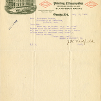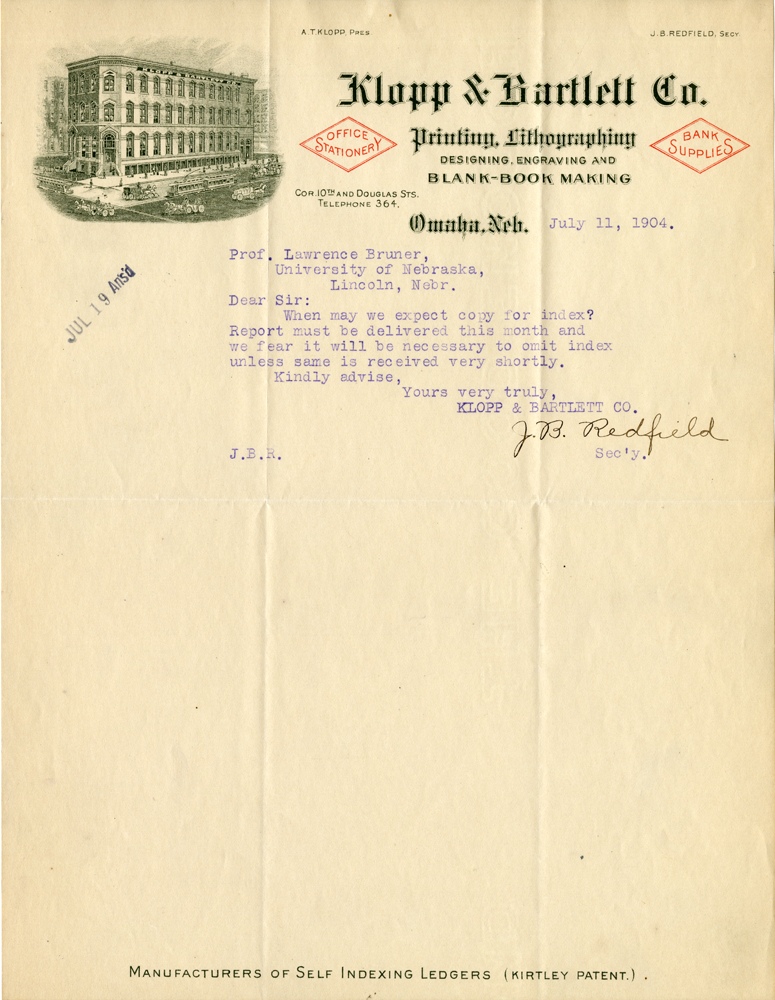 A. T. Klopp, Pres. J. B. Redfield, Secy Klopp & Bartlett Co. Printing, Lithographing Designing, Engraving and Blank-Book Making Office Stationery Bank Supplies Cor. 10th and Douglas Sts. Telephone 364. Omaha, Neb. July 11, 1904 Jul 19 Ans'd Prof. Lawrence Bruner, University of Nebraska, Lincoln, nebr. Dear Sir: When may we expect copy for index? Report must be delivered this month and we fear it will be necessary to omit index unless same is received very shortly. Kindly advise, Yours very truly, Klopp & Bartlett Co. J. B. Redfield Sec'y. J.B.R.