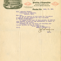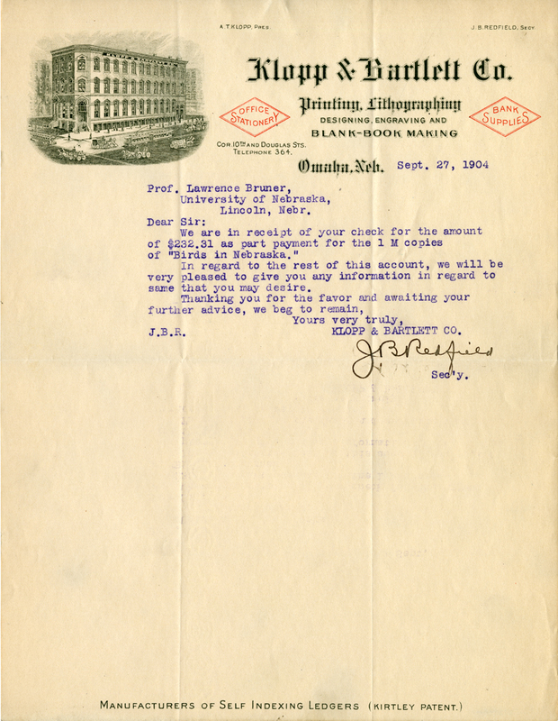A. T. Klopp, Pres. J. B. Redfield, Secy Klopp & Bartlett Co. Printing, Lithographing Designing, Engraving and Blank-Book Making Office Stationery Bank Supplies Cor. 10th and Douglas Sts. Telephone 364. Omaha, Neb. Sept. 27, 1904 Prof. Lawrence Bruner, University of Nebraska Lincoln, Nebr. Dear Sir: We are in receipt of your check for the amount of $232.31 as part payment for the 1M copies of "Birds in Nebraska." In regard to the rest of this account, we will be very pleased to give you any information in regard to same that you may desire. Thanking you for the favor and awaiting your further advice, we beg to remain, Yours very truly, Klopp & Bartlett Co. J.B. Redfield Sec'y. J.B.R.