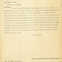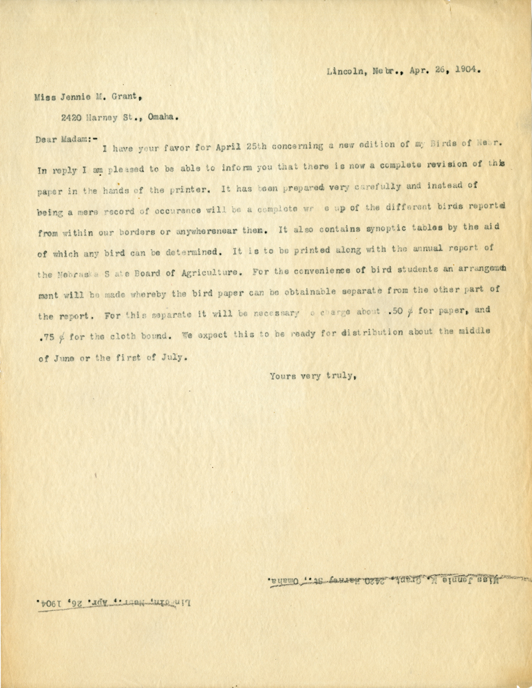 Lincoln, Nebr., Apr. 26, 1904. Miss Jennie M. Grant, 2420 Harney St., Omaha. Dear Madam:- I have your favor for April 25th concerning a new edition of my Birds of Nebr. In reply I am pleased to be able to inform you that there is now a complete revision of this paper in the hands of the printer. It has been prepared very carefully and instead of being a mere record of occurence will be a complete write up of the different birds reported from within our borders or anywhere near them. It also contains synoptic tables by the aid of which any bird can be determined. It is to be printed along with the annual report of the Nebraska State Board of Agriculture. For the convenience of bird students an arrangement will be made whereby the bird paper can be obtainable separate from the other part of the report. For this separate it will be necessary to charge about .50 cents for paper, and .75 cents for the cloth bound. We expect this to be ready for distribution about the middle of June or the first of July. Yours very truly,