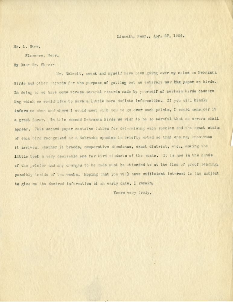 Lincoln, Nebr., Apr. 27, 1904. Mr. L. Skow. Florence, Nebr. My Dear Mr. Skow;- Mr. Wolcott, Swenk and myself have been going over my notes on Nebraska's Birds and other records for the purpose of getting out an entirely new paper on birds. In doing so we have come across several records made by yourself of certain birds concerning which we would like to have a little more definte information. If you will kindly inform me when and where I could meet with you to go over such points, I would consider it a great favor. In this second Nebraska Birds we wish to be so careful that no errors shall appear. This second paper contains tables for determining each species and the exact status of each bird recognized as a Nebraska species is briefly noted so that one may know when it arrives, whether it breeds, comparative abundance, exact district, etc., making the little book a very desirable one for bird students of the state. It is now in the hands of the printer and any changes to be made must be attended to at the time of proof reading, possibly inside of two weeks. Hoping that you will have sufficient interest in the subject to give me the desired information at an early date, I remain, Yours very truly,