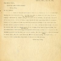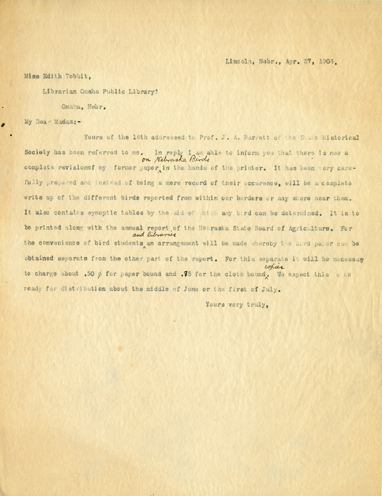 Lincoln, Nebr., Apr. 27, 1904. Miss Edith Tobbit, Librarian Omaha Public Library. Omaha, Nebr. My Dear Madam;- Yours of the 16th addressed to Prof. J. A. Barrett of the State Historical Society has been referred to me. In reply I am able to inform you that there is now a complete revision of my former paper on Nebraska Birds in the hands of the printer. It has been very carefully prepared and instead of being a mere record of their occurence, will be a complete write up of the different birds reported from within our borders or any where near them. It also contains synoptic tables by the aid which any bird can be determined. It is to be printed along with the annual report of the Nebraska State Board of Agriculture. For the convenience of bird students and librarians an arrangement will be made whereby the bird paper can be obtained separate from the other part of the report. For this separate it will be necessary to charge about .50 cents for paper bound and .75 for the cloth bound copies. We expect this to be ready for distribution about the middle of June or the first of July. Yours very truly,