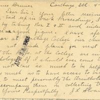 Carthage, Ill. 4 - 26 - 04 APR 28 1904 Lawrence Bruner Dear Sir: Your letter received recently. to cash tied up in back Proceedings, I can help you out by taking Nos I & II and index if you will make me a good figure. I have spent this school year at Carthage College our church school, and have not made plans for next year. No one of the Profs. at the College are interested in Ornithology. If I should ever come to the Uni. I would not care so much to be helped with expenses as much as to have access to big collections, libraries, to meet personally the Ornithologists & perhaps accompany them in collecting trips for the Univ. Yours Respectfully, J. L. Sloanaker.
