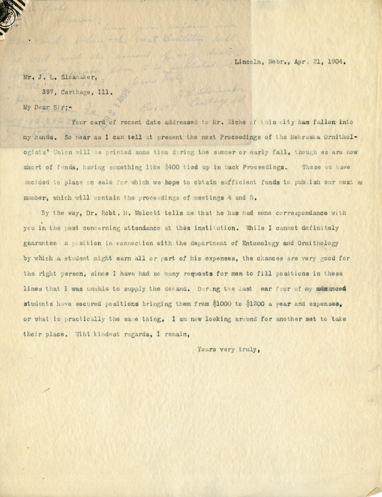 Lincoln, Nebr., Apr. 21, 1904. Mr. J. L. Sloanaker, 397, Carthage, Ill. My Dear Sir;- Your card of recent date addressed to Mr. Eiche of this city has fallen into my hands. So near as I can tell at present the next Proceedings of the Nebraska Ornithologists' Union will be printed some time during the summer or early fall, though we are now short of funds, having something like $400 tied up in back Proceedings. These we have decided to place on sale for which we hope to obtain sufficient funds to publish our next number, which will contain the proceedings of meetings 4 and 5. By the way, Dr. Robt. H. Wolcott tells me that he has had some correspondence with you in the past concerning attendance at this institution. While I cannot definitely guarantee a position in connection with the department of Entomology and Ornithology by which a student might earn all or part of his expenses, the chances are very good for the right person, since I have had so many requests for men to fill positions in these lines that I was unable to supply the demand. During the past year four of my advanced students have secured positions bringing them from $1000 to $1200 a year and expenses, or what is practically the same thing. I am now looking around for another set to take their place. Wiht kindest regards, I remain, Yours very truly,