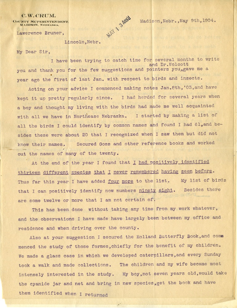 MAY 13 Ans'd C. W. CRUM County Superintendent Madison, Nebraska Madison, Nebr., May 9, 1904. Lawrence Bruner, Lincoln, Nebr. My Dear Sir, I have been trying to catch time for several months to write you and thank you for the few suggestions and pointers you and Dr. Wolcott gave me a year ago the first of last Jan. with respect to birds and insects. Acting on your advice I commenced making notes Jan. 8th, '03, and have kept it up pretty regularly since. I had herded for several years when a boy and thought my living with the birds had made me well acquainted with all we have in Northease Nebraska. I started by making a list of all the birds I could identify by common names and found I had 61, and besides these were about 20 that I recognized when I saw them but did not know their names. Secured Goss and other reference books and worked out the names of many of the twenty. At the end of the year I found that I had positively identified thirteen different species that I never remembered having seen before. Thus far this year I have added four more to the list. My list of birds that I can positively identify now numbers ninety eight. Besides there are some twelve or more that I am not certain of. This has been done without taking any time from my work whatever, and the observations I have made have largely been between my office and residence and when driving over the county. Also at your suggestion I secured the Holland Butterfly Book, and commenced the study of those formes, chiefly for the benefit of my children. We made a glass case in which we developed caterpillars, and every Sunday took a walk and made collections. The children and my wife became most intensely interested in the study, My boy, not seven years old, would take the cyanide jar and net and bring in new species, get the book and have them identified when I returned.