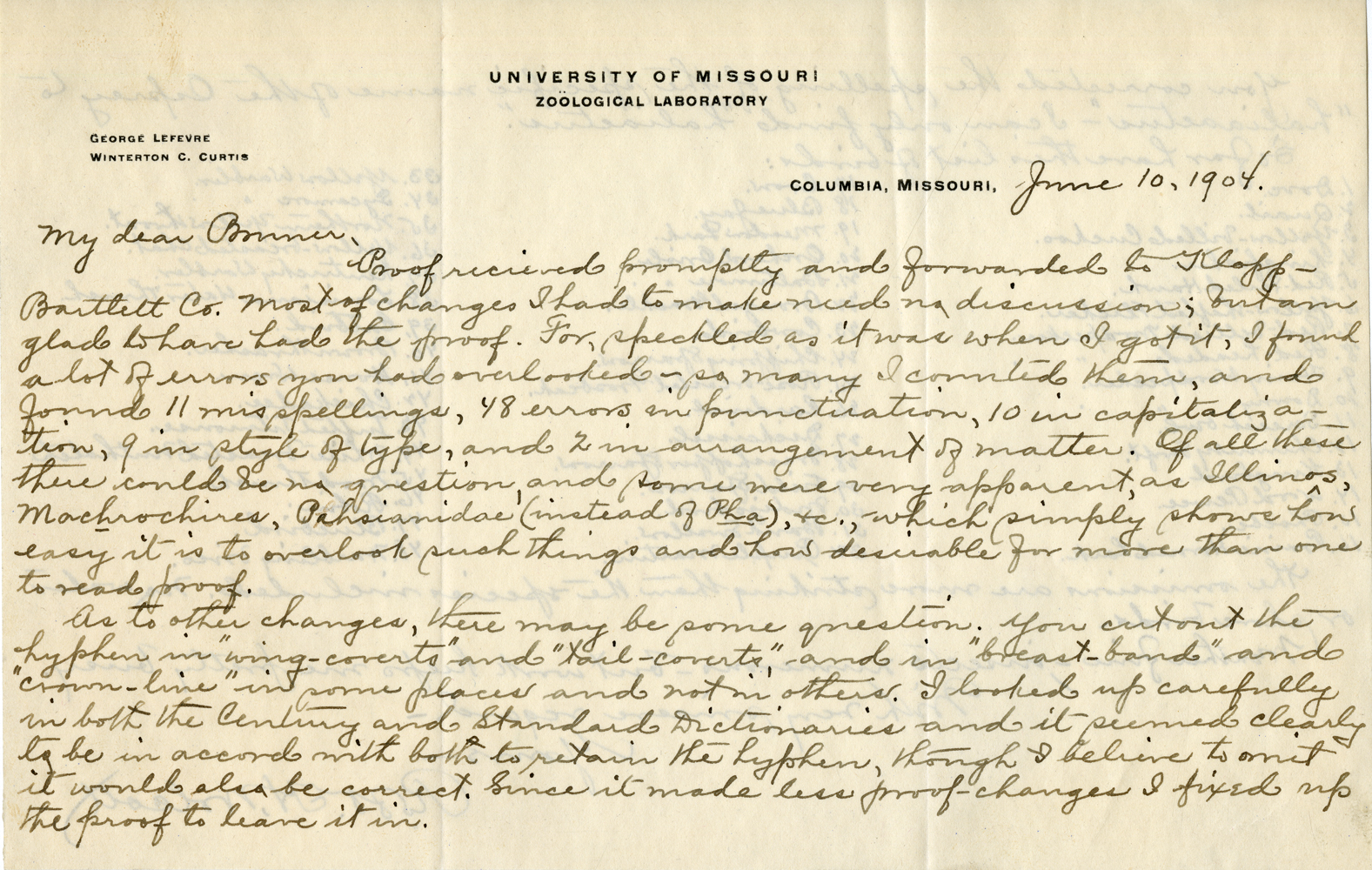 University of Missouri Zoological Laboratory George Lefevre Winterton C. Curtis Columbia, Missouri, June 10, 1904. My dear Bruner Proof received promptly and forwarded to Klopp-Bartlett Co. Most of changes I had to make need no discussion; but am glad to have had the proof. For speckled as it was when I got it, I found a lot of errors you had overlooked - so many I counted them, and found11 misspellings, 48 errors in punctuation, 10 in capitalization, 9 in style of type, and 2 in arramgement of matter. Of all these there could be no question, and some were very apparent, as Illinos, Machrochires, Pahsianidae (instead of Pha), &c., which simply shows how easy it is to overlook such things and how desirable for more than one to read proof. As to other changes, there may be some question. You cut out the hyphens in "wing-coverts" and "tail-coverts," and in breast-band" and "crown-line" in some places and not in others. I looked up carefully in both the Century and Standard Dictionaries and it seemed clearly to be in accord with both to retain the hyphen, though I believe to omit it would also be correct. Since it made less proof-changes I fixed up the proof to leave it in.