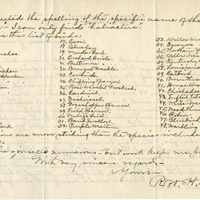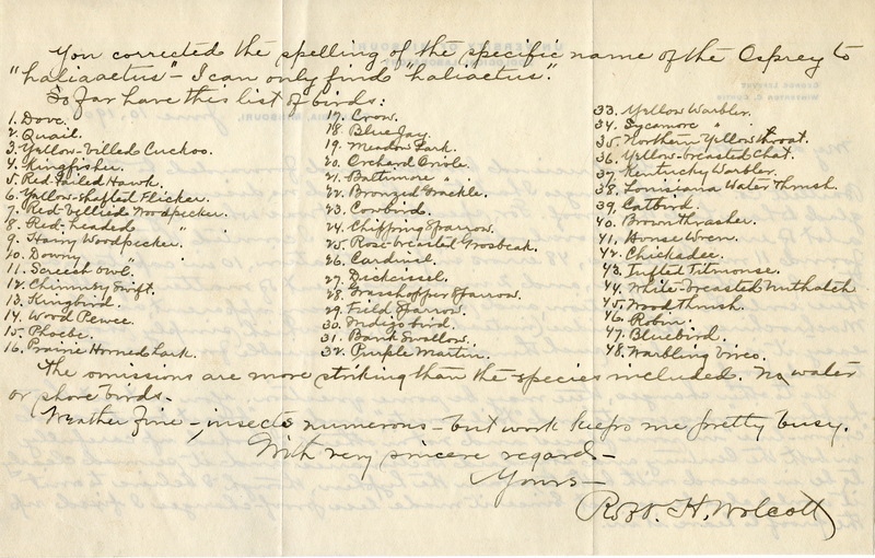 You corrected the spelling of the specific name of the Osprey to "haliaaetus" - I can only find "haliaetus." So far have this list of birds: 1. Dove. 2. Quail. 3. Yellow-billed Cuckoo. 4. Kingfisher. 5. Red-tailed Hawk. 6. Yellow-shafted Flicker. 7. Red-bellied Woodpecker. 8. Red-headed Woodpecker. 9. Hairy Woodpecker. 10. Downy Woodpecker. 11. Screech owl. 12. Chimney Swift. 13. Kingbird. 14. Wood Pewee. 15. Phoebe. 16. Prairie Horned Lark. 17. Crow. 18. Bluejay. 19. Meadow Lark. 20. Orchard Oriole. 21. Baltimore Oriole. 22. Bronzed Grackle. 23. Cowbirds. 24. Chipping Sparrow. 25. Rose-breasted Grosbeak. 26. Cardinal. 27. Dicksissel. 28. Grasshopper Sparrow. 29. Field Sparrow. 30. Indigo bird. 31. Barn Swallow. 32. Purple Martin. 33. Yellow Warbler. 34. Sycamore Warbler 35. Northern Yellowthroat. 36. Yellow-breasted chat. 37. Kentucky Warbler. 38. Louisiana Water Thrush 39. Catbird. 40. Brown thrasher. 41. House Wren. 42. Chickadee. 43. Tufted Titmouse. 44. White-breasted Nuthatch 45. Woodthrush 46. Robin 47. Bluebird. 48. Wrabling vireo. The omissions re more striking than the species included. No water or shore birds. Weather fine -, insects numerous - but work keeps me pretty busy. With my sincere regards - Yours— Robt. H. Wolcott