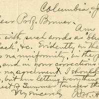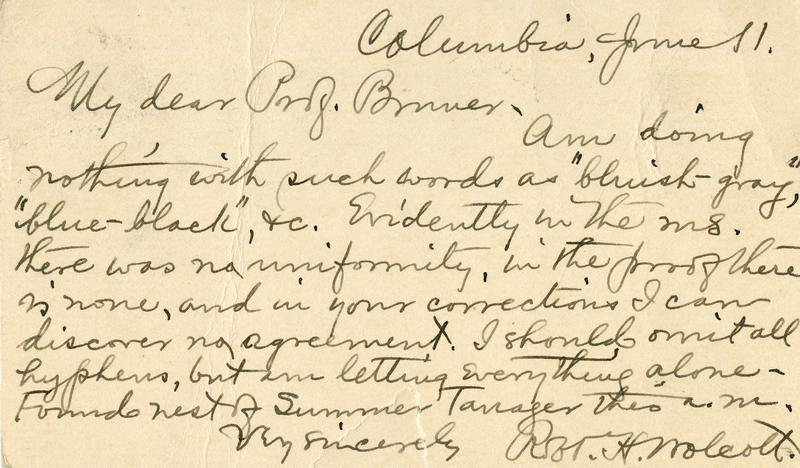 Columbia, June 11 My dear Prof. Bruner, Am doing nothing with such words as "bluish-gray," "blue-black," &c. Evidently in the ms. there was no uniformity, in the proof there is none, and in your corrections I can discover no agreement. I should omit all hyphens, but am letting everything alone. Found nest of Summer Tanager this a.m. Very sincerely Robt. H. Wolcott.