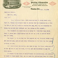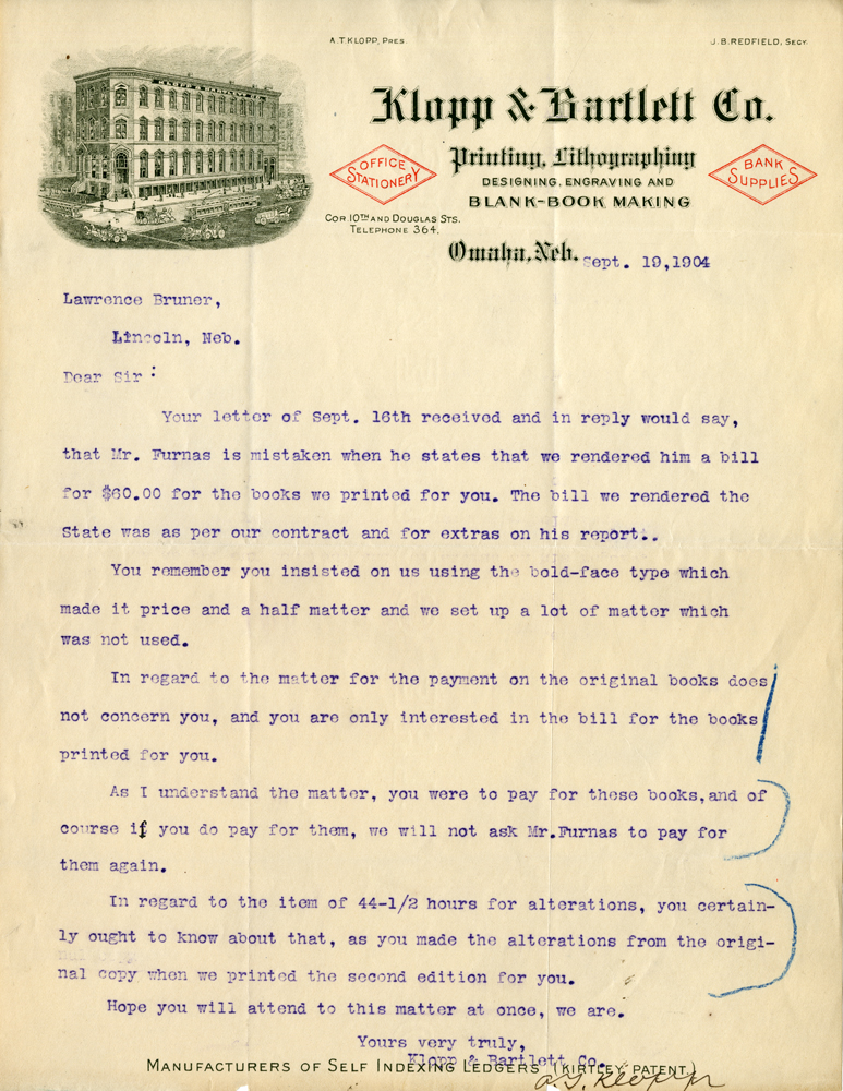 A. T. Klopp, Pres. J. B. Redfield, Secy Klopp & Bartlett Co. Printing, Lithographing Designing, Engraving and Blank-Book Making Office Stationery Bank Supplies Cor. 10th and Douglas Sts. Telephone 364. Omaha, Neb. Sept. 19, 1904 Lawrence Bruner, Lincoln, neb. Dear Sir: Your letter of Sept. 16th received and in reply would say, that Mr. Furnas is mistaken when he states that we rendered him a bill for $60.00 for the books we printed for you. The bill we rendered the State was as per our contract and for extras on his report. You remember you insisted on us using the bold-face type which made it price and a half matter and we set up a lot of matter which was not used. In regard to the matter for the payment on the original books does not concern you, and you are only interested in the bill for the books printed for you. As I understand the matter, you were to pay for these books, and of course if you do pay for them, we will not ask Mr. Furnas to pay for them again. In regard to the item of 44-1/2 hours for alterations, you certainly ought to know about that, as you made the alterations from the original copy when we printed the second edition for you. Hope you will attend to this matter at once we are, Yours very truly Klopp & Bartlett Co. G. Klopp Manufacturers of Self Indexing Ledgers (Kirtley Patent)