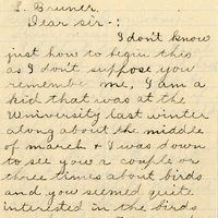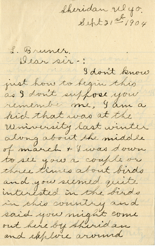 Sheridan Wyo. Sept. 21st 1904 L. Bruner. Dear sir-: I don't know just how to begin this as I don't suppose you remember me. I am a kid that was at the University last winter along about the middle of march & I was down to see you a couple or three times about birds and you seemed quite interested in the birds in this country and said you might come out here by Sheridan and explore around