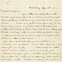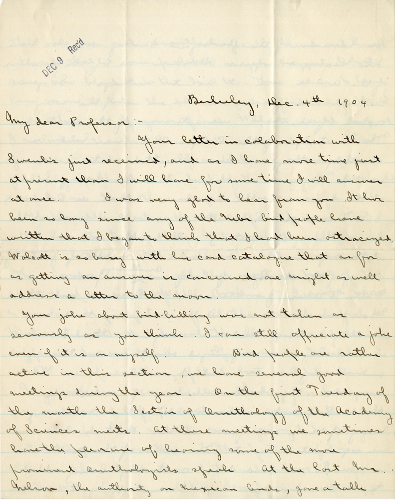 DEC 9 Rec'd Berkeley, Dec. 4th 1904 My dear Professor:- Your letter in colaboration with Swenk's just received, and as I have more time just at present than I will have for some time I will answer at once. I was very glad to hear from you. It has been so long since any of the Nebr. bird people have written that I began to think that I had been ostracized. Wolcott is so busy with his card catalogue that as far as getting an answer is concerned one might as well address a letter to the moon. Your joke about bird-killing was not taken as seriously as you think. I can still appreciate a joke even it is on myself. Bird people are rather active in this section. we have several good meetings during the year. On the first Tuesday of the month the Section of Ornithology of the Academy of Sciences meets. At those meetings we sometimes have the pleasure of hearing some of the more prominent ornithologists speak. At the last Mr. Mel[illegible], the authority on Mexican birds, gave a talk