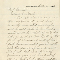 Reilly's Barber Shop, J.G. Reilly, Prop.... Bath Room, Laundry Agency. Elgin, Nebraska, Dec 7 1904 Prof Bruner Lincoln, Neb. Dear sir -: I am an amateur taxidermist and have recently mounted two eagles and would like to have information as to what species they belong and as Mr. Bell of the firm of Sessions + Bell of Norfolk recommended you I will ask the favor of an answer. The first bird is a kind of brownish grey and has part of the leg bare of feathers and the front claws are all of nearly equal length. The second is a black bird with the back of the head and neck
