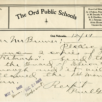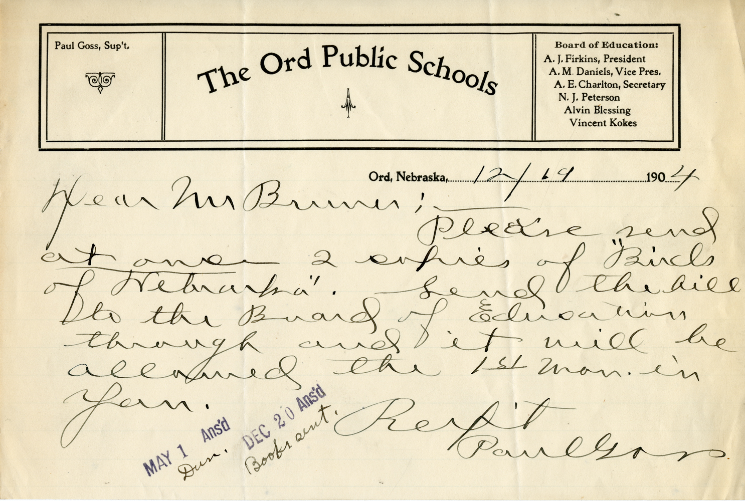Paul Goss, Sup't. The Ord Public Schools Board of Education: A. J. Firkinsm President A. M. Daniels, Vice Pres. A. E. Charlton, Secretary N. J. Peterson Alvin Blessing Vincent Kokes Ord, Nebraska, 12/19 1904 Dear Mr. Bruner:- Please send at once 2 copies of "Birds of Nebraska". Send the bill to the Board of Education through and it will be allowed the 1st Mon. in Jan. Resp't Paul Goss MAY 1 Ans'd Dun. DEC 20 Ans'd Books sent.