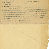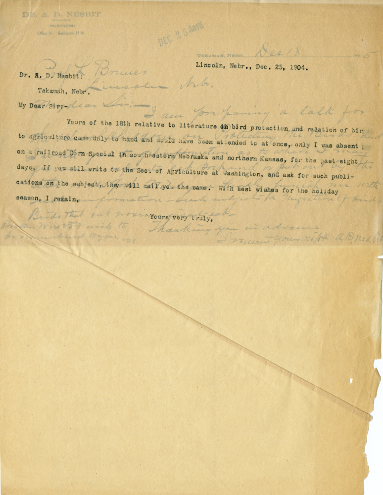 Lincoln, Nebr., Dec. 25, 1904. Dr. A. D. Nesbit: Takamah, Nebr. My Dear Sir:- Yours of the 18th relative to literature on bird protection and relation of bir to agriculture came duly to hand and would have been attended to at once, only I was absent on a railroad Corn Special in southeastern Nebraska and northern Kansas, for the past eight days. If you will write to the Sec. of Agriculture at Washington, and ask for such publications on the subject, they will mail you the same. With best wishes for the holiday season, I remain, Yours very truly,