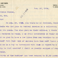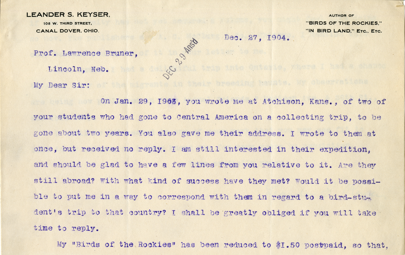 Leander S. Keyser. 108 W. Third Street. Canal Dover, Ohio. Author of "Birds of the Rockies." "In Bird Land," Etc., Etc. Dec. 27, 1904. Dec 29 Ans'd Prof. Lawrence Bruner, Lincoln, Neb. My Dear Sir: On Jan. 29, 1963, you wrote me at Atchison, Kans., of two of your students who had gone to Central America on a collecting trip, to be gone about two years. You also gave me their address. I wrote to them at once, but received no reply. I am still interested in their expedition, and should be glad to have a few lines from you relative to it. Are they still abroad? With what kind of success have they met? Would it be possible to put me in a way to correspond with them in regard to a bird-student's trip to that country? I shall be greatly obliged if you will take time to reply. My "Birds of the Rockies" has been reduced to $1.50 postpaid, so that,