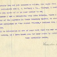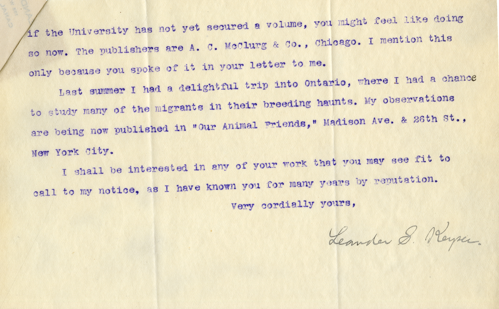 if the University has not yet secured a volume, you might feel like doing so now. The publishers are A. C. McClurg & Co., Chicago. I mention this only because you spoke of it in your letter to me. Last summer I had a delightful trip into Ontario, where I had a chance to study many of the migrants in their breeding haunts. My observations are being now published in "Our Animal Friends," Madison Ave. & 26th St., New York City. I shall be interested in any of your work that you may see fit to call to my notice, as I have known you for many years by reputation. Very cordially yours, Leander S Keyser