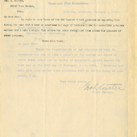 Lincoln, Nebr., Jan. 7, 1905. Geo. L. Carter, Chief Game Warden, City. My Dear Sir:- In reply to your favor of the 6th in instant I take pleasure in reporting that during the year 1904 I took no specimens nor eggs of Nebraska birds for scientific purposes neither did I take a single fish within the state during that time either for pleasure or other purposes. Yous very truly,