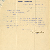 ter. Chief Warden ravelling Deputy Traveling Deputy en, Supt. Hatcheries John N. Mickey, Commissioner Ex-Officio Chief Game Warden's Office Lincoln, Nebraska State Fish Hatcheries South Bend, Nebraska State of Nebraska Game and Fish Commission Lincoln, Nebraska. January 6, 1905. Jan 7 Ans'd Prof. Lawrence Bruner, University of Nebraska,, City. My dear Sir: Under the requirements of our statutes it will be necessary for you to file a report of the number and kinds of birds taken under and by virtue of scientific permit issued for your use on the 12th day of Fabruary, A. D. 1904. Trusting You will give this matter your attention with as little dalay as possible, I am, Very truly yours, Geo L. Carter Chief Warden.