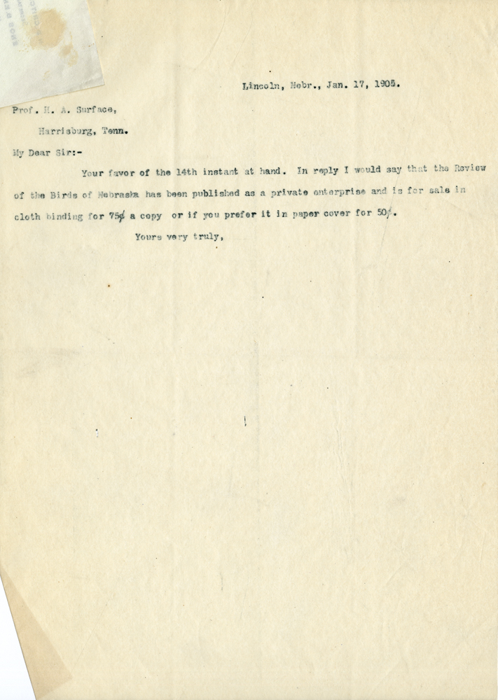 Lincoln, Nebr., Jan. 17, 1905. Prof. R. A. Surface, Hrrisburg, Tenn. My Dear Sir:- Your favor of the 14th instant at hand. In reply I would say that the Review of the Birds of Nebraska has been published as a private enterprise and is for sale in cloth binding for 75 cents a copy or if you prefer it in paper cover for 50 cents. Yours very truly,
