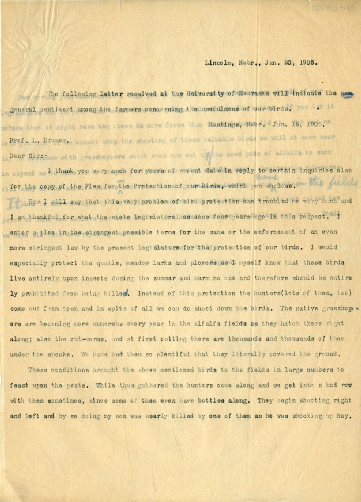 Lincoln, Nebr., Jan. 20, 1905. The following letter received at the University of Nebraska will indicate the general sentiment among the farmers concerning the usefulness of our birds. Hastings, Nebr., Jan. 16, 1905. Prof. L. Bruner, Dear Sir:- I thank you very much for yours of recent date in reply to certain inquiries also for the copy of the Plea for the Protection of our Birds, which you enclose. Now I will say that this very problem of bird protection has troubled me very much and I am thankful for what the state legislature has done four years ago in this respect. I enter a plea in the strongest possible terms for the same or the enforcement of an even more stringent law by the present legislature for the protection of our birds. I would especially protect the quails, meadow larks and plovers as I myself know that these birds live entirely upon insects during the summer and harm no one and therefore should be entirely prohibited from being killed. Instead of this protection the hunters (lots of them, too) come out from town and in spite of all we can do shoot down the birds. The native grasshoppers are becoming more numerous every year in the alfalfa fields as they hatch there right along; also the cutworms, and at first cutting there are thousands and thousands of them under the shocks. We have had them so plentiful tht they literally covered the ground. These conditions brought the above mentioned birds to the fields in large numbers to feast upon the pests. While thus gathered the hunters come along and we get into a bad row with them sometimes, since some of them even have bottles along. They begin shooting right and left and by so doing my man was nearly killed by one of them as he was shocking up hay.