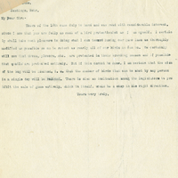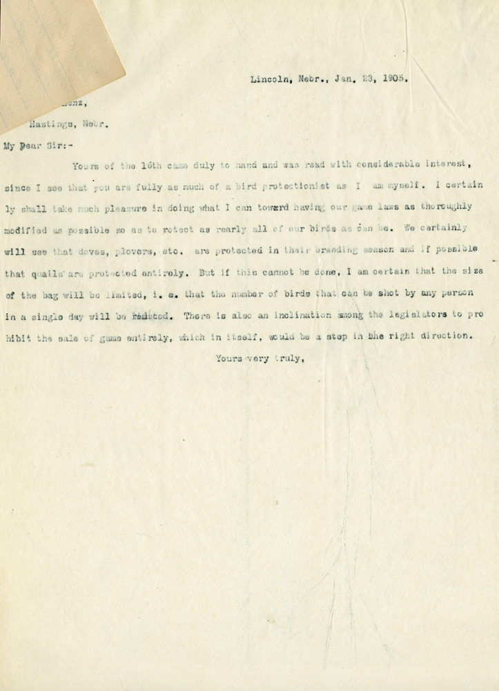 Lincoln, Nebr., Jan. 13, 1905. nz, Hastings, Nebr. My Dear Sir:- Yours of the 16th came duly to hand and was read with considerable interest, since I see that you are fully as much of a bird protectionist as I am myself. I certainly shall take much pleasure in doing what I can toward having our game laws as thoroughly modified as possible so as to rotect as nearly all of our birds as can be. We certainly will see that doves, plovers, etc. are protected in their breeding season and if possible that quails are protected entirely. But if this cannot be done, I am certain that the size of the bag will be limited, i. e. that the number of birds that can be shot by any person in a single day will be reduced. There is also an inclination among the legislators to prohibit the sale of guns entirely, which in itself, would be a step in the right direction. Yours very truly,