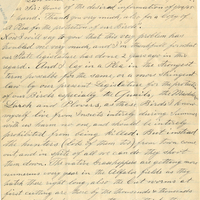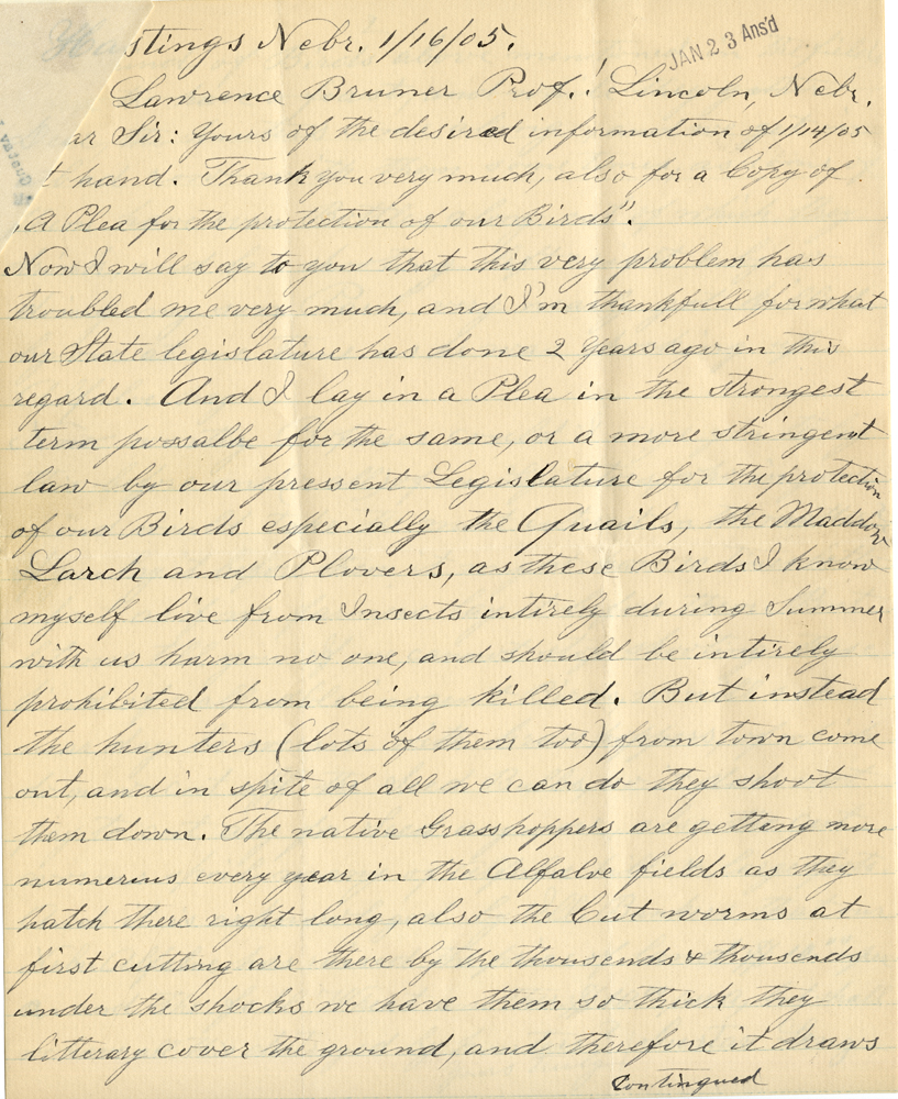stings, Nebr. 1/16/05. JAN 23 Ans'd Lawrence Bruner Prof. Lincoln, Nebr. r Sir: Yours of the desired information of 1/14/05 at hand. Thank you very much, also for a copy of "A plea for the protection of our Birds". Now I will say to you that this very problem has troubled me very much, and I'm thankful for what our State legislture has done 2 years ago in this regard. And I lay in a Plea in the strongest term possible for the same, or a more stringent law by our present Legislature for the protection of our Birds especially the Quails, the Maddow Larck and Plovers, as these Birds I know myself live from insects intirely during Summer with no harm no one, and should be intirely prohibited from being killed. But instead the hunters (lots of them too) from town come out and in spite of all we can do they shoot them down. The native Grasshoppers are getting more numerous every year in the Alfalve fields as they hatch there right long, also the Cut worms at first cutting are there by the thousends & thousands under the shocks we have them so thick they litteray cover the ground, and therefore it draws Continued