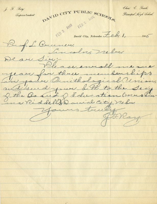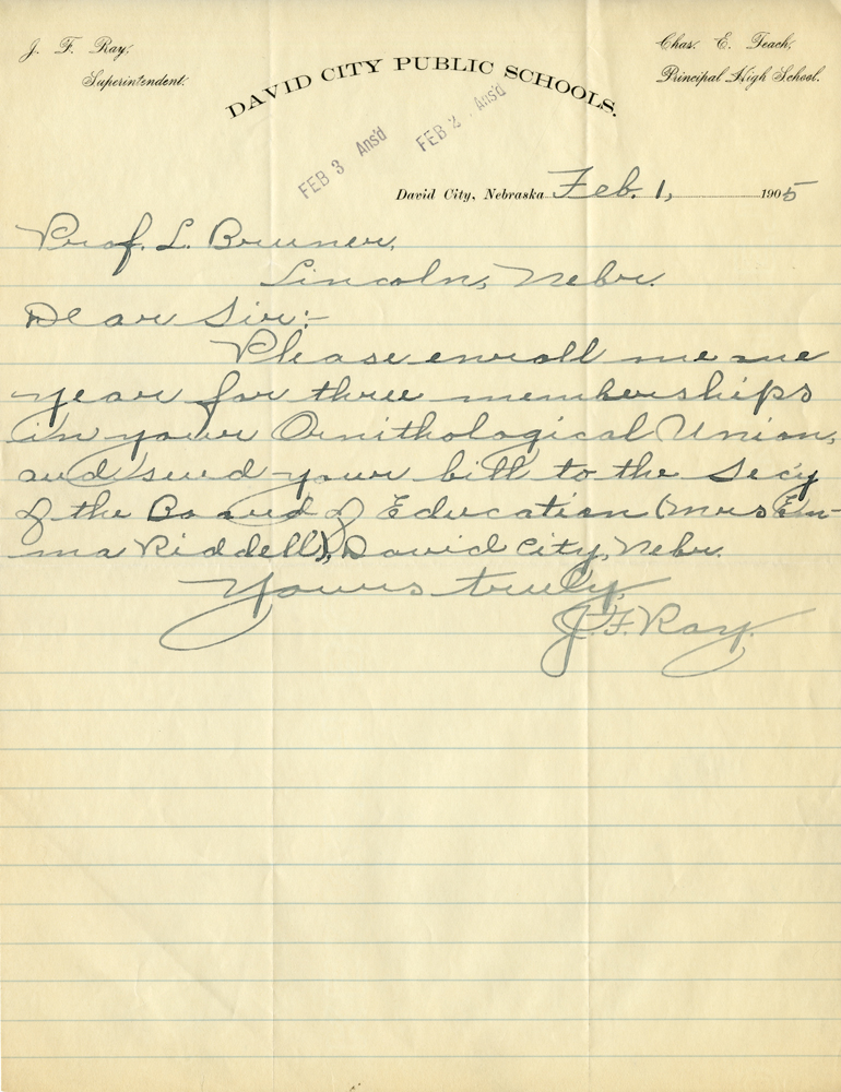 J. F. Ray Superintendent. Chas. E. Teach Principal High School DAVID CITY PUBLIC SCHOOLS. FEB 3 Ans'd FEB 2 Ans'd David City, Nebraska Feb. 1, 1905 Prof. L. Bruner, Lincoln, Nebr. Dear Sir:- Please enroll me one year for three memberships in your Ornithological Union and send your bill to the Sec'y of the Board of Education (Mrs. Emma Riddell), David City, Nebr. Yours truly,