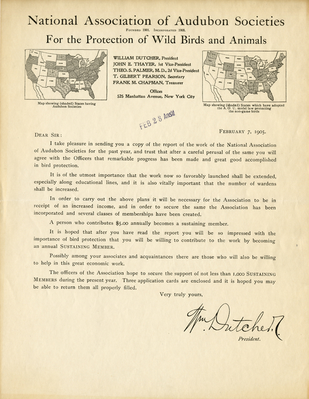 National Association of Audubon Societies Founded 1901. Incorporated 1905. For the Protection of Wild Birds and Animals William Dutcher, President John E. Thayer, 1st Vice-President Theo. S. Palmer, M. D., 2d Vice-President T. Gilbert Pearson, Secretary Frank M. Chapman, Treasurer Offices 525 Manhattan Avenue, New York City Map showing (shaded) States having Audubon Societies Map showing (shaded) States which have adopted the A. U. U. model law protecting the non-game birds FEB 28 Ans'd February 7, 1905. Dear Sir: I take pleasure in sending you a copy of the report of the work of the National Association of Audubon Societies for the past year, and trust that after a careful perusal of the same you will agree with the Officers that remarkable progress has been made and great good accomplished in bird protection. It is of utmost importance that the work now so favorably launched shall be extended, especially along educational lines, and it is also vitally important that the number of wardens shall be increased. In order to carry out the above plans it will be necessary for the Assocaition to be in receipt of an increased income, and in order to secure the same the Association has been incorporated and several classes of memberships have been created. A person who contributes $5.00 annually becomes a sustaining member. It is hoped that after you have read the report you will be so impressed with the importance of bird protection that you will be willing to contribute to the work by becoming an annual Sustaining Member. Possibly among your associates and acquaintances there are those who will also be willing to help in this great economic work. The officers of the Association hope to secure the support of not less than 1,000 Sustaining Members during the present year. Three appliciation cards are enclosed and it is hoped you may be able to return them all properly filled. Very truly yours, Wm. Dutcher President.